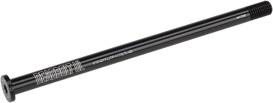 Salsa Deadbolt Ultralight Thru-Axle Rear 12mm Axle Diameter 217mm Length 1.75 Thread Pitch 20mm Thread Length. The Deadbolt Ultralight Thru-Axles are offered in a 6mm flat button head design for a flush clean look. Lightweight easy to use and secure.CNC-machined from 7000 series aluminum